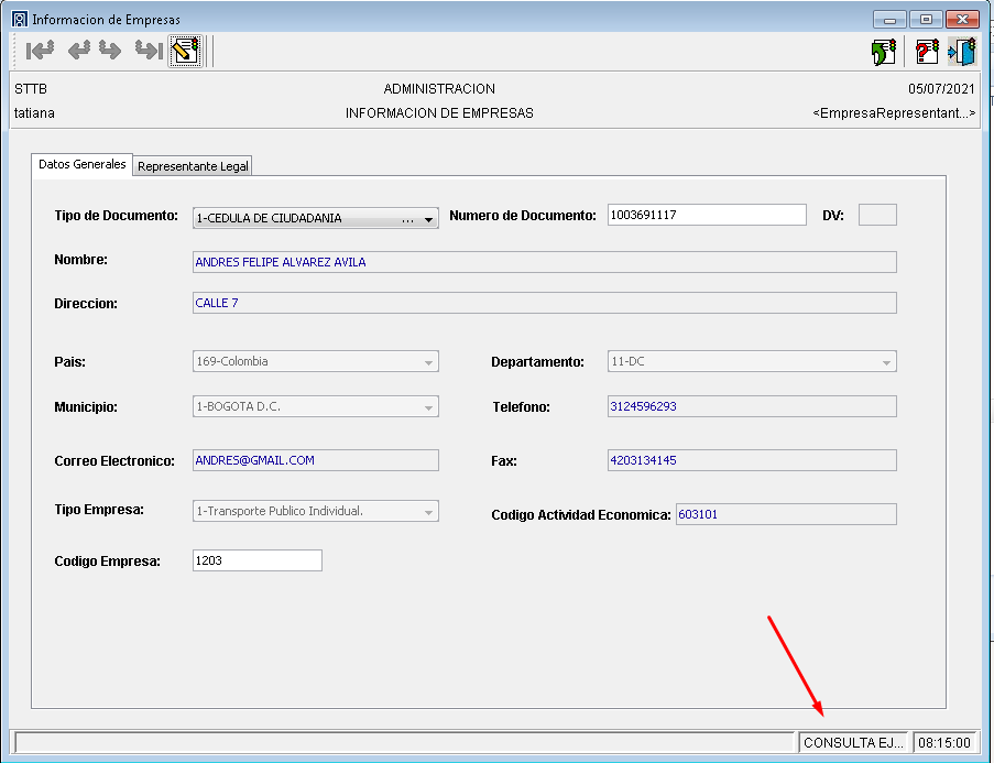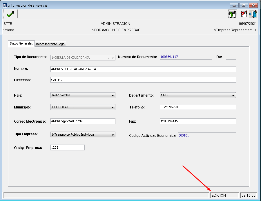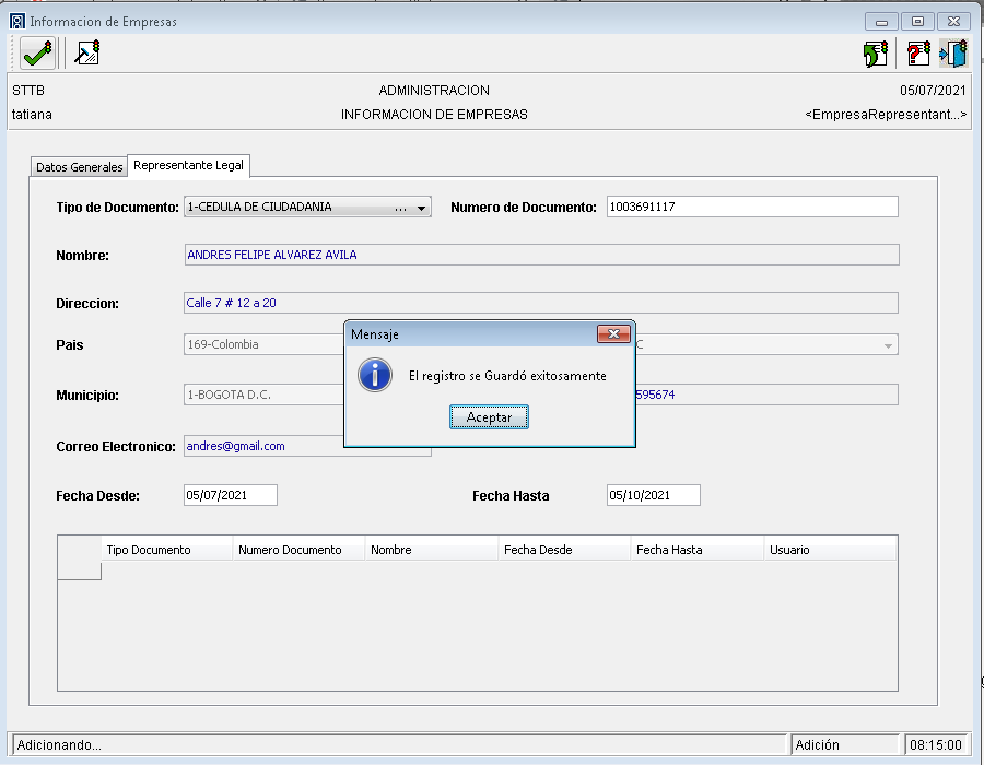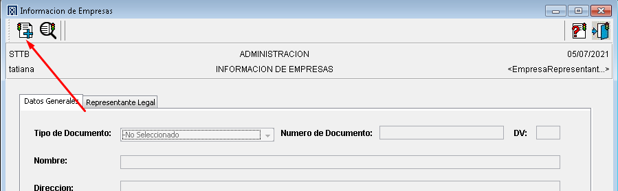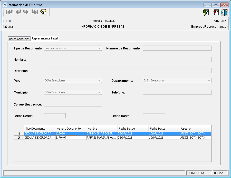 Cada vez que se actualiza el tipo y numero de documento del representante legal se crea un registro en la parte inferior de la ventana donde se puede visualizar el histórico de representantes legales asociados a la empresa. Esta información NO puede ser eliminada.