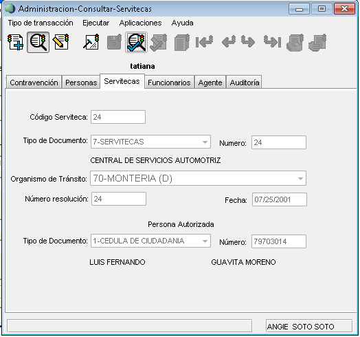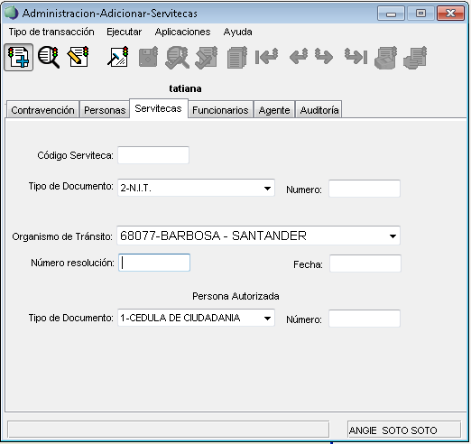 Para hacer la consulta de una serviteca debe dar clic en el icono (Consultar). Luego el cursor se ubica para que sea posible el ingreso de los datos en cada campo.