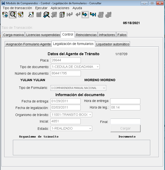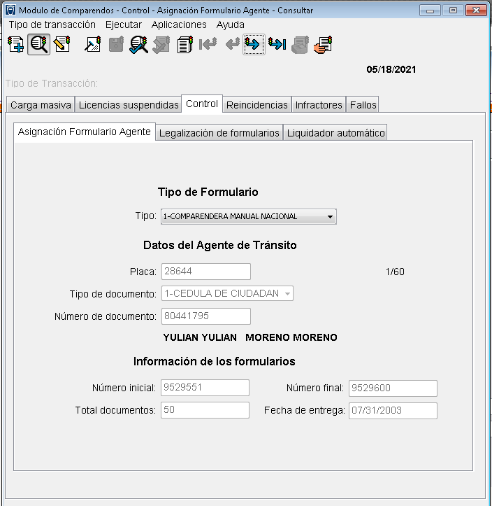 Esta opción permite manejar la asignación de formularios entregados a los agentes de tránsito.