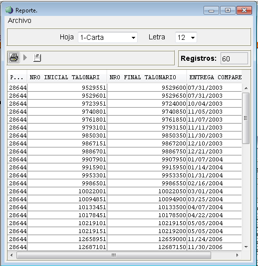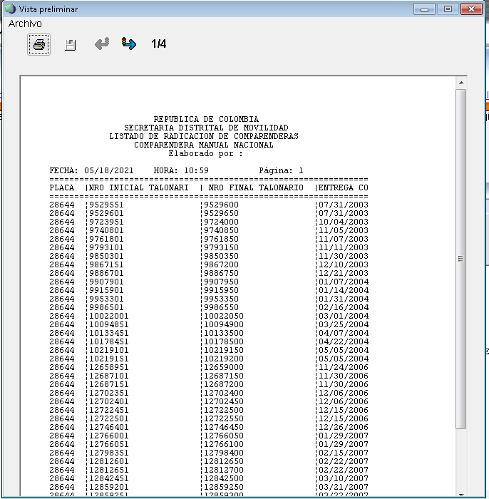 Al hacer clic sobre (generar informe) genera el reporte indicando para cada registro: Placa del agente, Número inicial del talonario asignado, Número final del talonario asignado y Fecha entre que se entrega la comparenderá.