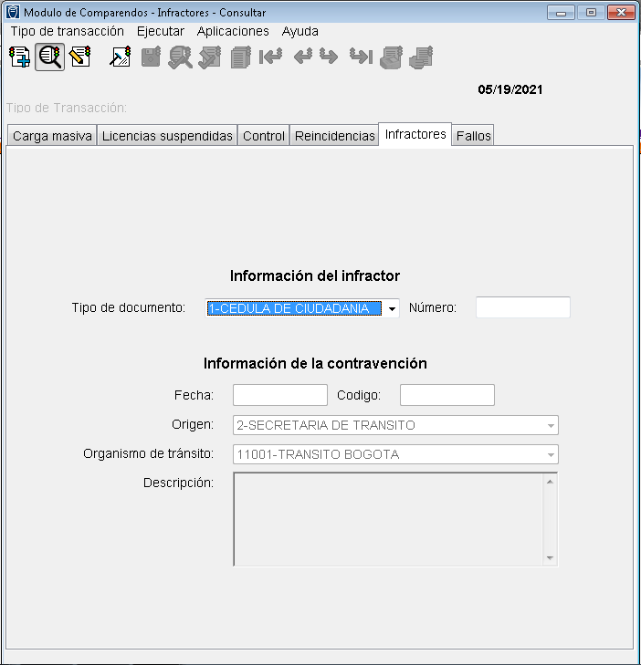 Esta opción permite consultar información de los infractores y las infracciones que han cometido. Se debe tener en cuenta que esta opción se aplica de acuerdo al antiguo Código de Tránsito.