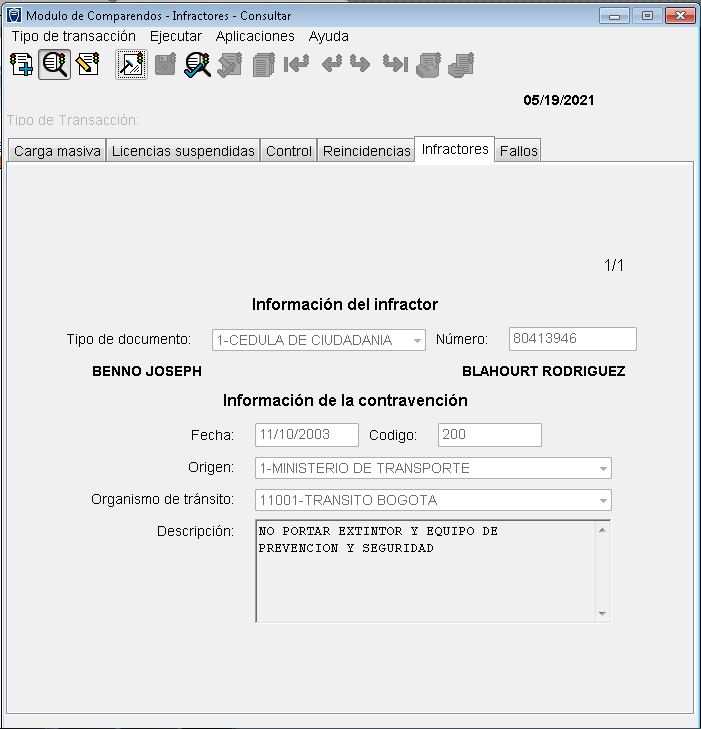Luego el cursor se ubica en el campo número donde tiene que escribir el número de identificación del infractor a buscar y luego dar clic en el icono (consultar) y se mostrara la consulta en la misma ventana como se muestra en la siguiente imagen.