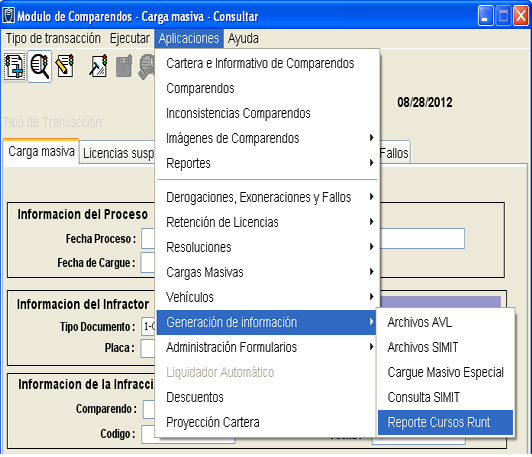 Para llegar al aplicativo solo hay que seguir la ruta: Modulo comparendo > Aplicaciones > Generación de información > Reporte cursos RUNT.