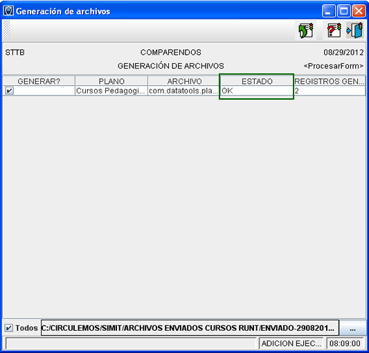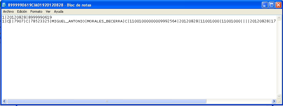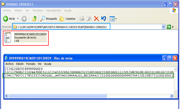 Nótese que en la imagen se puede observar la ruta del archivo (recuadro azul), el documento creado (recuadro rojo) y el contenido del informe, que en ese ejemplo se puede leer que existe un segundo registro (recuadro verde), que fue modificado; es fácil notarlo al ver que tiene la letra “M”, mientras que el registro anterior contiene la letra “C”.