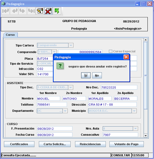 Una vez que haya diligenciados los campos necesarios para ejecutar la búsqueda (para este ejemplo se utilizó el número de cedula del asistente), hacer clic sobre el botón (Aceptar).
